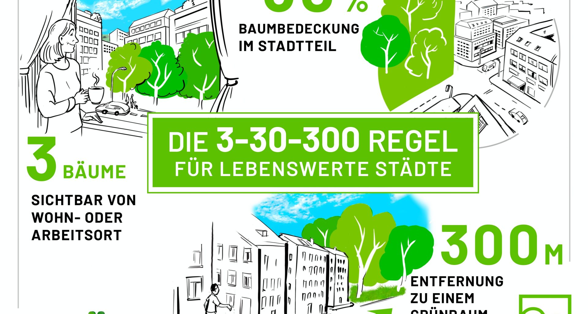 Um die städtischen Lebensräume widerstandsfähiger zu machen, fordert die Initiative „Grün in die Stadt“ die flächendeckende Anwendung der „3-30-300-Regel“, die im Jahr 2021 vom niederländischen Wissenschaftler Cecil Konijnendijk als einfache Leitlinie für die Stadtbegrünungentwickelt wurde: