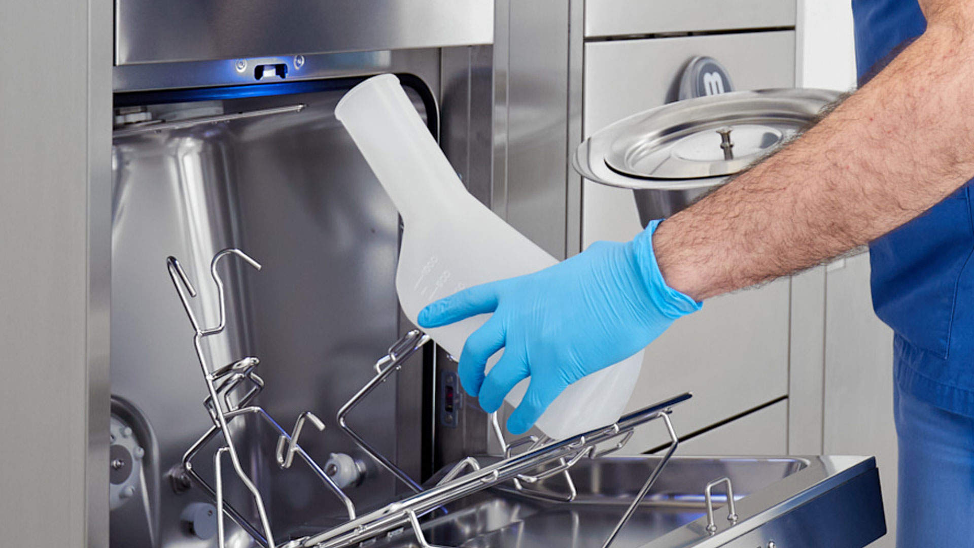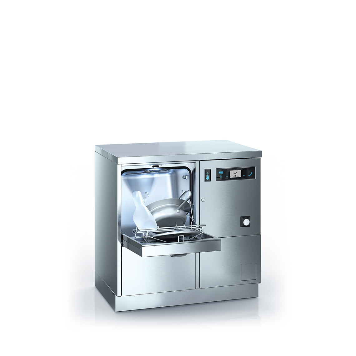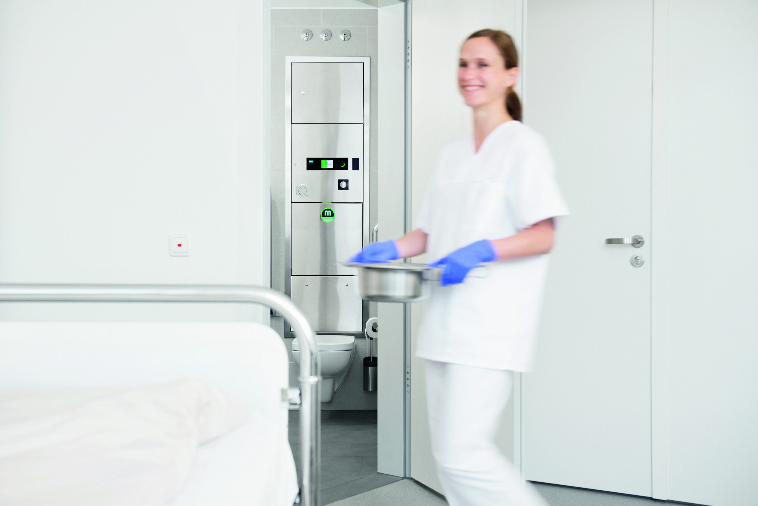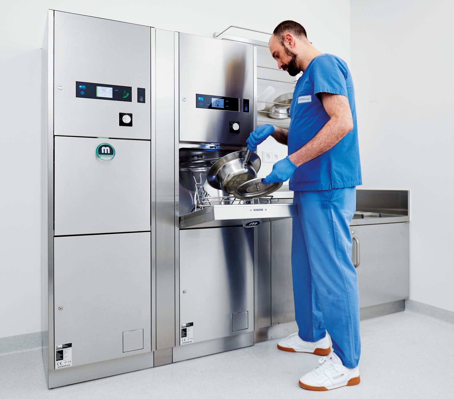 Möglich macht das eine echte Neuheit im Markt: die Beladungserkennung von Meiko. Das Assistenzsystem schlägt das passende Programm zum eingesetzten Pflegegeschirr vor und startet es nach einigen Sekunden automatisch. In Kombination mit der Automatiktür – je nach Ausführung mit Handsensor oder Fußtaster – entfällt auch das Öffnen und Schließen des Geräts per Hand.