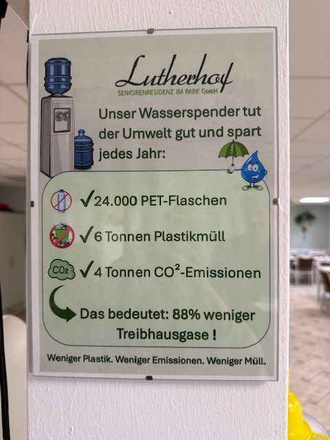Ob die Umstellung auf Recyclingpapier oder die Nutzung von Trinkwasserspendern statt Einwegflaschen – diese Veränderungen sind nah am Alltag und zeigen, dass nachhaltiges Handeln auch in der Pflege möglich ist. Und genau darum ging es im gemeinsamen Projekt „Pflege mit Zukunft: Machbares machen im Lutherhof“.