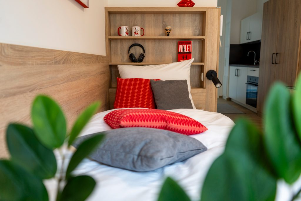 Die Wohnanlage in der Donaustraße 50 ist zentral gelegen und gewährleistet eine schnelle Erreichbarkeit von Hochschule, top Ausbildungsbetrieben und zwei Kliniken in unmittelbarer Nähe. Die vollmöblierten Appartements bestehen aus Ein- und Zwei-Zimmer-Einheiten mit Wohnflächen von ca. 20 m² bis ca. 53 m². Sie verfügen über ein eigenes Bad und eine Einbauküche mit hochwertigen Markengeräten – darunter Backofen, Herd, Dunstabzug und Kühlschrank. Zur weiteren Ausstattung gehören ein Bett, Kleiderschrank, Regal und Garderobe, Schreibtisch mit Utensilienschrank und Schreibtischstuhl sowie Vorhänge und Deckenleuchten. Auch an Anschlüsse für Telefon, TV und EDV ist gedacht, Highspeed-Internet via Glasfaserkabel inklusive. Über die eigene Klingel- und Haussprechanlage lässt sich Besuch empfangen.